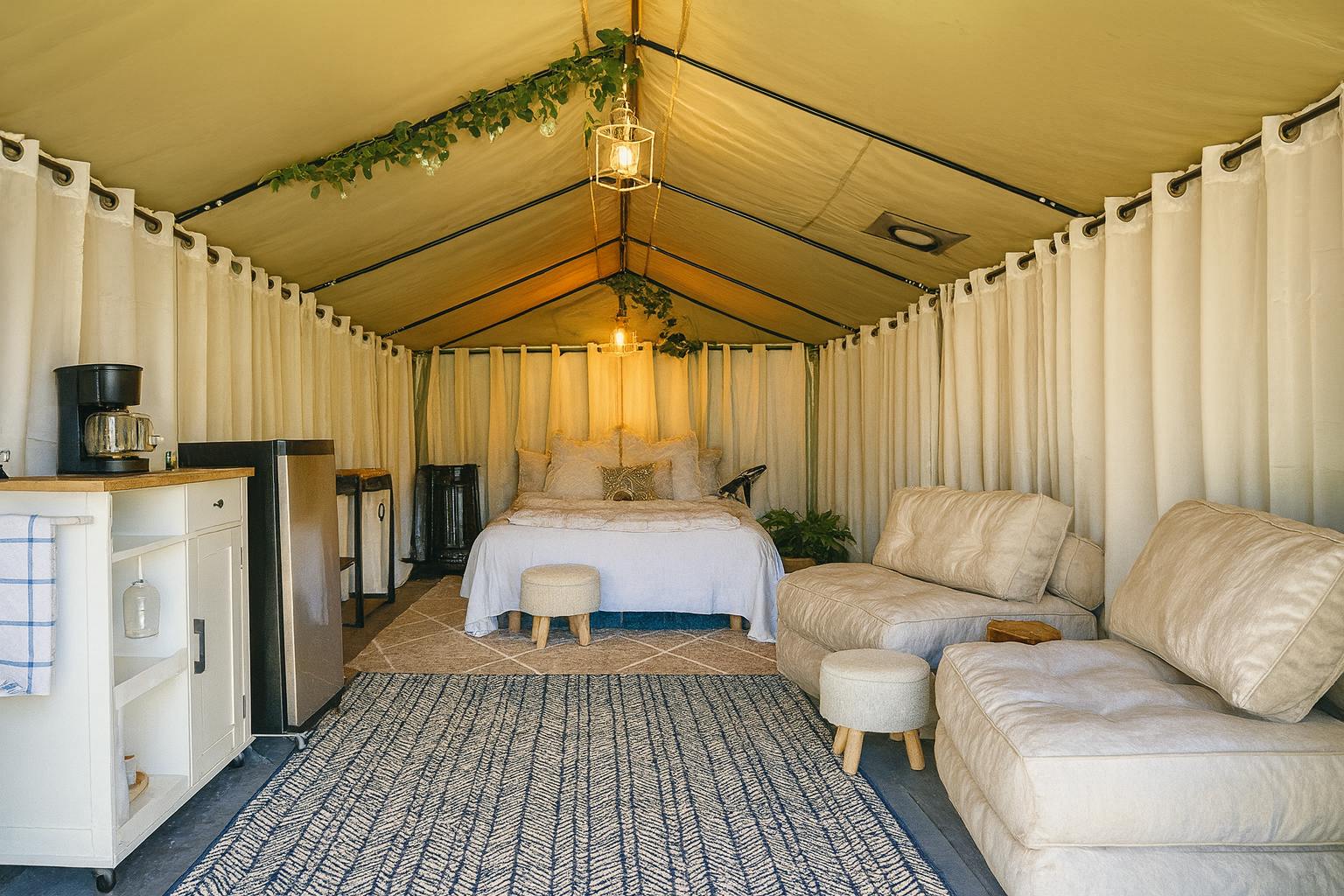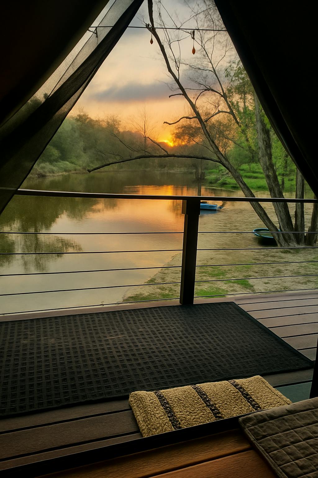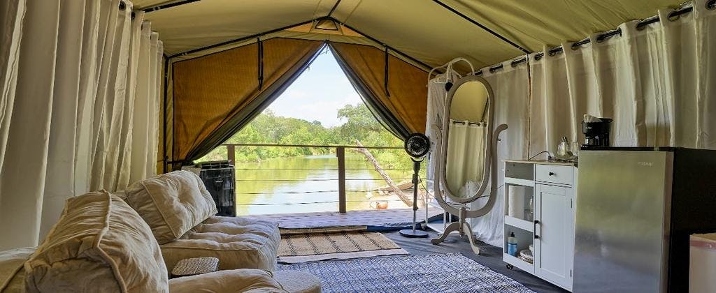 Drift into comfort under the stars at Goats on the Bayou Farm LLC. This waterfront glamping tent blends the adventure of the outdoors with the cozy touches of home.